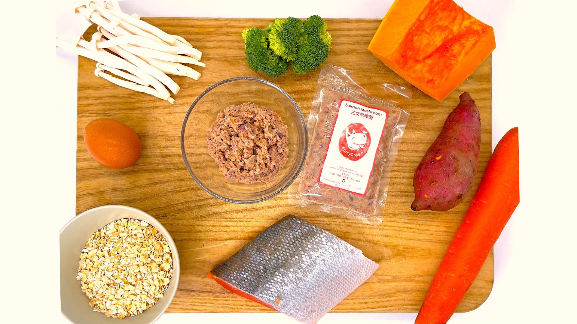 材料:三文魚、石班魚、薯仔、番薯、甘荀、燕麥、雞蛋、菇菌、雜菜、蛋殼粉、海藻粉
